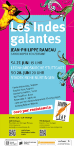 Die Ballettoper ,Les Indes galantes‘ entführt nach einem Prolog mit Liebesgeschichten in vier ferne Länder, so in die Türkei, nach Persien, Peru und zu der indigenen Bevölkerung Nordamerikas. Die Musik stammt vom französischen Barockkomponisten Jean-Philippe Rameau (1683-1764), das Libretto schieb Louis Fuzelier (1674-1752).Samstag, 27. Juni 2026, 19 Uhr